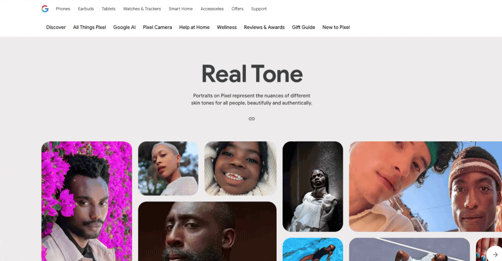 For the launch of Real Tone on Pixel, I lead the content strategy, UX, and Copywriting for the feature landing page.